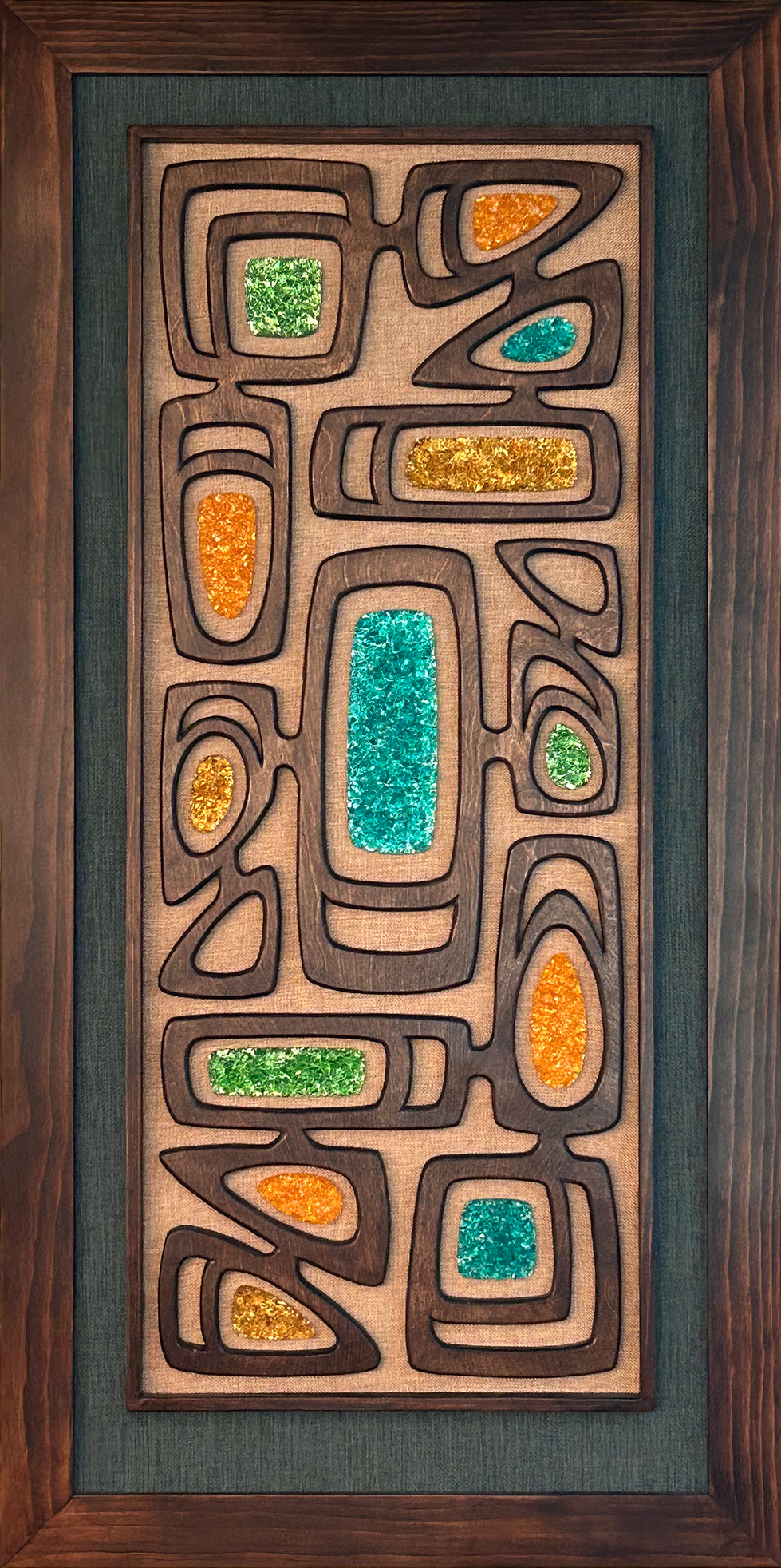 Mid Century Modern shapes crafted from hand-finished wood paneling flow together to create a cubist design while recalling Polynesian motifs. The figures are mounted on a neutral canvas within an inner frame and embellished with glass and resin “gems” which appear to give off a light of their own.